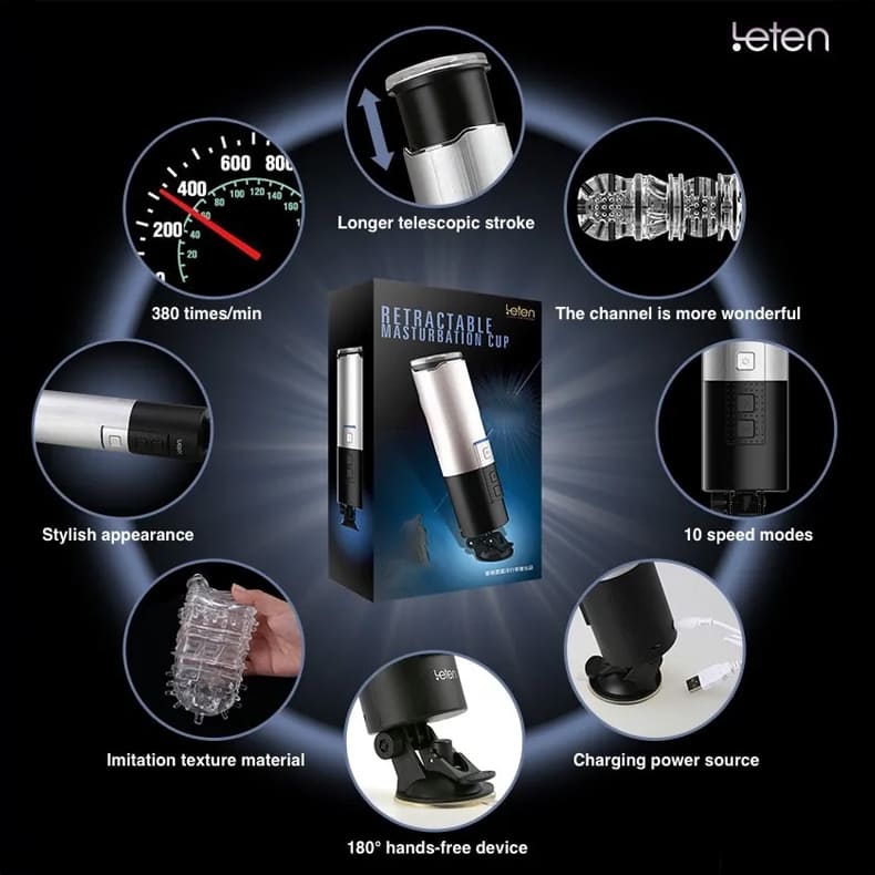 Mach dich bereit für ein intensives, vollautomatisches Lust-Erlebnis mit dem Leten X9 3RD Masturbator für Männer – dem Hightech-Wunder unter den teleskopischen Penis Vibratoren. Mit bis zu 380 Stößen pro Minute, 10 verschiedenen Vibrationsmodi und einer einstellbaren Saugnapfbasis bietet dieses Gerät absolute Freiheit und explosive Stimulation ganz nach deinem Geschmack.